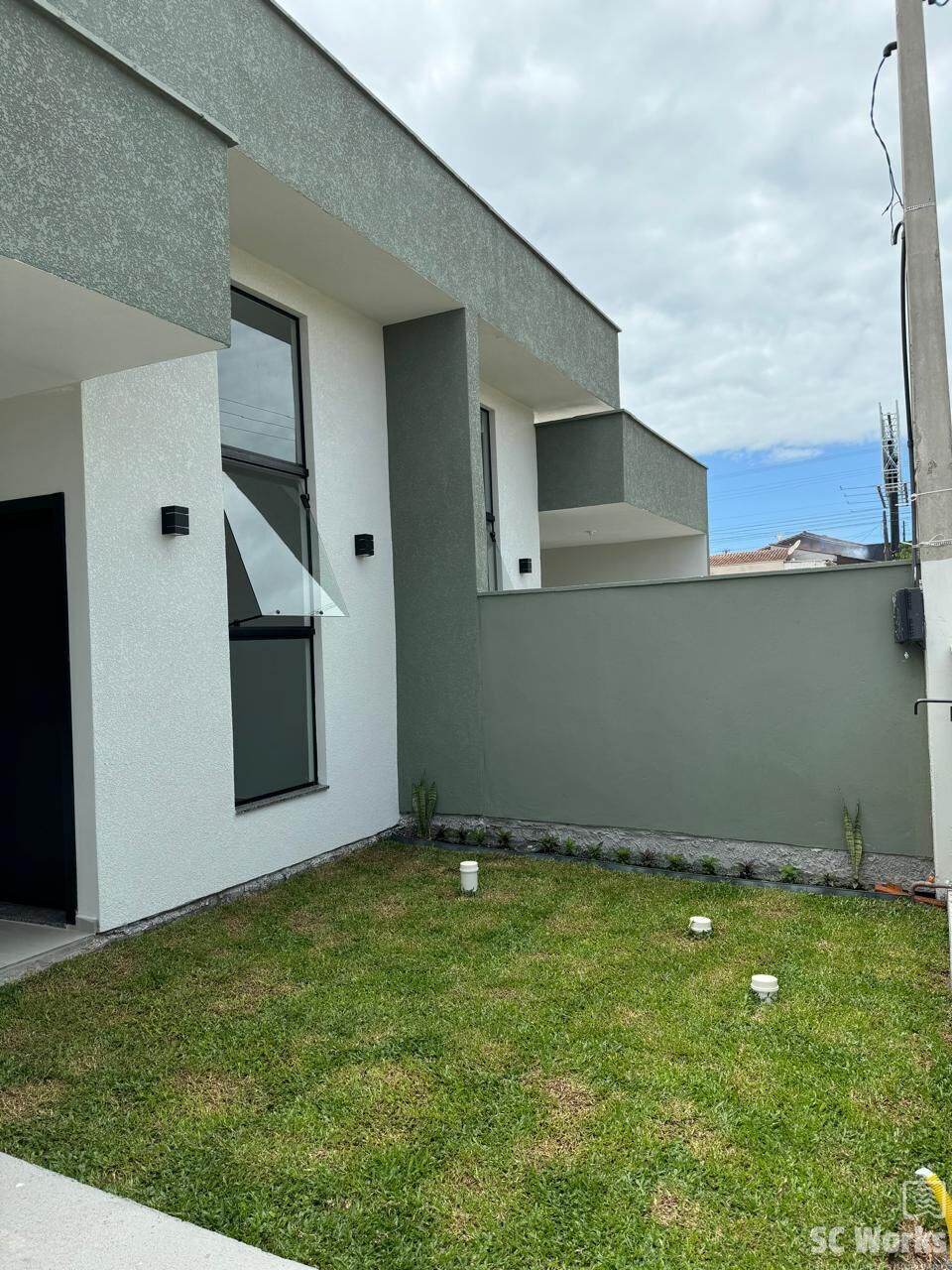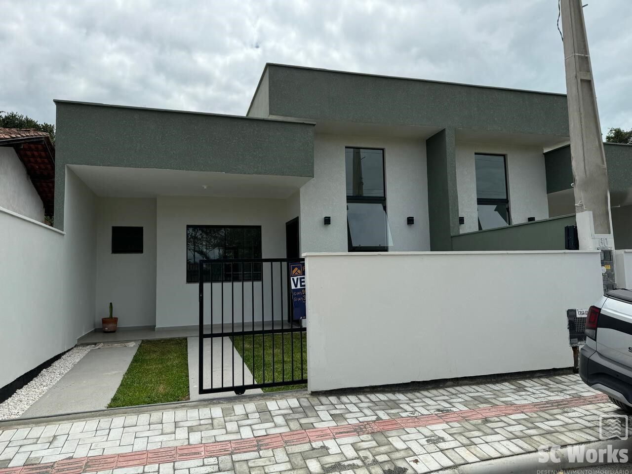 Casa com dois quartos sendo um suíte, sala e cozinha conjugado, área de lavanderia e churrasqueira e espaço nos fundos.